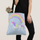Unicorn bag with pink, gold glitter and magical rainbow colors! Text in gold with a white and gold unicorn and rainbow against a sky blue background. Back of bag is gold with white magical stars. Perfect for your little girl!