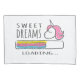 This pastel colored unicorn pillow case features a cute pink haired sleepy unicorn with the text " Sweet Dreams Loading " and a pastel rainbow loading screen.
