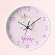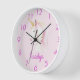 A soft pink background decorated with a cute unicorn face in white and pink. Personalize and add a name, pink letters. Pink clock-face numbers.