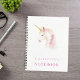 A girly notebook for school, journaling or diary. White background, decorated with a cute pink watercolored unicorn. Personalize and add a name.