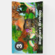 A cute design of two rainbows over lush green fields filled with evergreen and fall colored trees. A mushroom house with little doors and windows appear on the banks and a colorful pixie with purple hair is sitting outside with her basket filled with mushrooms. A pretty pink unicorn is lying on the far bank next to wild mushrooms and a large black circle appears in the top left corner with the birthday girls age and a white template below for your personalized wording.