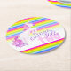 Second birthday party coasters, featuring a whimsical mythical unicorn watercolor painting and colorful rainbow stripes. Personalize with your own choose of name. Currently reads Happy Birthday Abigail two. Unique drawing, watercolor painting art and graphic design by Sarah Trett www.sarahtrett.com for www.mylittleeden.com