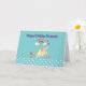 A whimsical happy birthday greeting card. Designed with a child-like theme. White polka dots decorating the bottom border on a blue green background. A happy unicorn frolicks underneath a colorful rainbow with