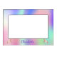 Rainbow, holographic background in pink, purple, rose gold and mint green and decorated with two golden unicorns. Personalize and add a name, purple letters. The name is written with a modern hand lettered style script.