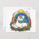 A unicorn greets the Bluebird of Happiness over the rainbow in a bright land of peace and abundance.