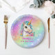 A magical Unicorn paper plate featuring a beautiful unicorn against a rainbow background with glittery sparkles. Designed in purples, lavenders and pinks and personalized with your information. Matching party supplies available.