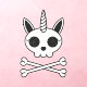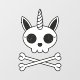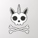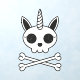 This graphic art piece combines the whimsical and the macabre, featuring a stylized skull with large, expressive eyes, a unicorn horn, and cat-like ears. As seen on Sophie's t-shirt, the skull is accompanied by crossbones, enhancing its playful yet gothic appeal. The design uses a simple black and white color scheme, which emphasizes the bold and graphic nature of the illustration. This unique blend of elements makes it a perfect choice for those who appreciate a blend of fantasy, dark humor, and minimalist art.