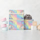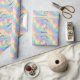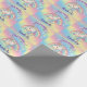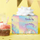 This cute and colorful wrapping paper features a beautiful illustration of a unicorn and pastel colored rainbow, over a rainbow gradient background. Faux gold glitter accents the top and bottom portions of the illustration. Little stars in matching colors surround the rainbow. A sample Happy Birthday banner is printed above the unicorn, and a sample name is printed below in an elegant purple script font. You can personalize the gift wrap to include your own custom name or text.