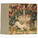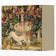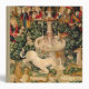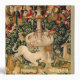 This unicorn tapestry is an enhanced reproduction of the "The Unicorn is Found" tapestry, which is the second tapestry of a series of seven medieval tapestries that showcases the mythical unicorn.The series is entitled "The Hunt of the Unicorn" which are also referred to as the Unicorn Tapestries". The tapestries were created from 1495-1505. This Unicorn is Found tapestry shows a group of medieval noblemen and hunters, as well as all kinds of ferocious lions and leopards. There is a unicorn at the front, a beautiful white unicorn, which has its horn pointed downward as it kneels. There is a medieval fountain between the unicorn and the huntsmen.