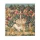 This unicorn tapestry is an enhanced reproduction of the "The Unicorn is Found" tapestry, which is the second tapestry of a series of seven medieval tapestries that showcases the mythical unicorn.The series is entitled "The Hunt of the Unicorn" which are also referred to as the Unicorn Tapestries". The tapestries were created from 1495-1505. This Unicorn is Found tapestry shows a group of medieval noblemen and hunters, as well as all kinds of ferocious lions and leopards. There is a unicorn at the front, a beautiful white unicorn, which has its horn pointed downward as it kneels. There is a medieval fountain between the unicorn and the huntsmen.