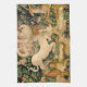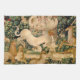 This unicorn tapestry is an enhanced reproduction of the "The Unicorn is Found" tapestry, which is the second tapestry of a series of seven medieval tapestries that showcases the mythical unicorn.The series is entitled "The Hunt of the Unicorn" which are also referred to as the Unicorn Tapestries". The tapestries were created from 1495-1505. This Unicorn is Found tapestry shows a group of medieval noblemen and hunters, as well as all kinds of ferocious lions and leopards. There is a unicorn at the front, a beautiful white unicorn, which has its horn pointed downward as it kneels. There is a medieval fountain between the unicorn and the huntsmen.