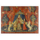 The Lady and The unicorn, a medieval tapestry from around 1500, is one of a set of French tapestries, considered great works of art from the Middle Ages. This Lady and the Unicorn tapestry is a stunning image of a lady standing in a tent, with a unicorn on one side of her, and a lion on the other. There's a little white dog sitting on a bench next to her, and a handmaiden on the other side. The tapestry's background is a red field of flowers and animals, including dogs, rabbits, and birds. The original medieval Unicorn tapestry was quite damaged and lost much of its original bright coloring and quality. While we were able to restore some of the Unicorn tapestry's original red and blue medieval coloring, please be aware that there are still imperfections in the image. However, ours is a unique version of this medieval tapestry, as we have extended it and enhanced it to bring out its original beauty.