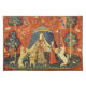 The Lady and The unicorn, a medieval tapestry from around 1500, is one of a set of French tapestries, considered great works of art from the Middle Ages. This Lady and the Unicorn tapestry is a stunning image of a lady standing in a tent, with a unicorn on one side of her, and a lion on the other. There's a little white dog sitting on a bench next to her, and a handmaiden on the other side. The tapestry's background is a red field of flowers and animals, including dogs, rabbits, and birds. The original medieval Unicorn tapestry was quite damaged and lost much of its original bright coloring and quality. While we were able to restore some of the Unicorn tapestry's original red and blue medieval coloring, please be aware that there are still imperfections in the image. However, ours is a unique version of this medieval tapestry, as we have extended it and enhanced it to bring out its original beauty.