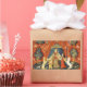 The Lady and The unicorn, a medieval tapestry from around 1500, is one of a set of French tapestries, considered great works of art from the Middle Ages. This Lady and the Unicorn tapestry is a stunning image of a lady standing in a tent, with a unicorn on one side of her, and a lion on the other. There's a little white dog sitting on a bench next to her, and a handmaiden on the other side. The tapestry's background is a red field of flowers and animals, including dogs, rabbits, and birds. The original medieval Unicorn tapestry was quite damaged and lost much of its original bright coloring and quality. While we were able to restore some of the Unicorn tapestry's original red and blue medieval coloring, please be aware that there are still imperfections in the image. However, ours is a unique version of this medieval tapestry, as we have extended it and enhanced it to bring out its original beauty.