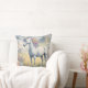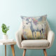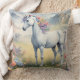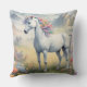 A larger throw pillow showing a dreamy image of a white unicorn with a rainbow mane standing in a field of flowers. In the background are majestic mountains. The perfect gift to give those who love magical and mystical unicorns. Contains generative content.
