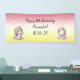 This banner shows two happy unicorns, with daisies, on a gradient background. The text reads, "Happy 10th Birthday, Alexandra! 01-30-24," and is customizable. It's perfect for including at a unicorn-themed event!