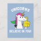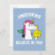 "Unicorns Believe In You" unicorn graphic designed by bCreative shows a pink haired unicorn with a flag and foam finger to cheer you on! This makes a great gift for family, friends, or a treat for yourself! This funny graphic is a great addition to anyone's style. bCreative is a leading creator and licensor of original, trendy designs and properties. ©LCT Creative. License from bCreative.com
