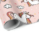 Blush pink wrapping paper with a unicorn pattern with fluffy clouds and confetti. The unicorns are white with flowing manes and tails in pinks and yellows. Perfect for a kid's birthday party!