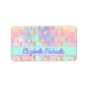 A trendy rainbow colored, holographic background with unicorn and rainbow pastel colors in pink, purple, mint green. Decorated with drips in pink and purple and a golden unicorn pattern. A mint green band. A bookplate, label for school books, textbooks. Personalize and add a name, written with a girly modern hand lettered style script. Purple colored letters.