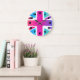 Cool looking watercolor design of the British flag / union jack. Bright and vivid watercolors include pink, purple, blue, turquoise and orange. The colors mix and blend together creating soft edges with a cloud like effect. The clockface uses a black font iwith big bold numbers. Easy to read clock with an artistic flair.