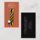 A fresh new take on a barber's business card, featuring a retro modern vibe, with gold glitter and black striped barber pole and a youthful unique burnt orange background to liven up your style. Depart from classic gold and black with this fresh twist on retro-modern. For men's hair cutting and grooming, shaves, beard trims and all barber services.