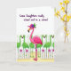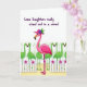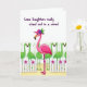 A heartfelt greeting card features a tall pink long‑necked bird standing front and center, its wide eyes and slightly tilted head giving it a friendly, affectionate look ❤️. It wears a wide-brim hat in deep pink, decorated with a purple flower and small green leaves that add a romantic, dressed-up touch. Behind it, a line of similar long‑necked birds stretches into the background in uniform lime green, their repeated shapes making the leading bird feel like the one reaching out to you. The contrast between the bright pink figure and the softer green crowd creates a sweet “you and me” focus, like a close friend stepping forward from the group. A simple greeting is placed near the top in a dark tone against the light background, easy to read without stealing attention from the illustration 🌼. Any smaller text sits lower on the card in a matching color, leaving plenty of open space around the birds and fence. Along the bottom edge, a white picket fence runs across the scene, dotted with small fuchsia flowers and neat posts.