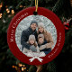 Spread holiday cheer with this custom photo Christmas ornament featuring a hand-drawn bow that crowns your favorite photo in a circular frame - creating. This elegant red and white Christmas tree ornament includes your custom message on the back, your family name and one photo. The perfect stocking stuffer or favor gift for friends and family!