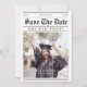 This creative calendar-style "Save the Date" graduation card features three photos of the graduate, capturing key moments of their journey. The design includes a calendar grid with the graduation date clearly marked, highlighted with a special icon, like a graduation cap. The combination of the photos and calendar grid adds a personal touch, while the newspaper-style layout keeps it modern and unique. It’s the perfect way to announce the celebration and mark the unforgettable day on your loved ones' calendars!