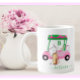 A charming unique golf cart -- pink and green -- tastefully done -- ready to run the course -- coffee / tea mug--This is a great gift for all golf lovers -- fun / attractive / unique. Personalize it with your/her initials/monogram. If you have any design questions or a special request, please send an email to: charmdesignstudio@rcn.com