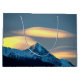 The unusual shape of the clouds and the way they catch the late day sun make them appear glowing. A beautiful blue sky with snow covered mountains set below. Clouds above assume the look of hoovering UFO's instead of a peaceful grouping of light clouds illuminated from the golden rays of a late days sun.