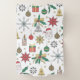 Pretty hand-drawn Christmas doddles illustration, composed of Xmas tree red and golden ball ornaments, Santa with the red hat, green holly leaves and red berries, golden bows, light-up candles, red poinsettia flower, Christmas star, gray and golden bells, stars, and snowflakes, on a solid white background. A seasonal trendy fashion colors Christmas theme, sweet festive winter holidays decor.