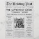 The front page features your wedding headline, ceremony details, and a custom photo, while the back page shares your story, wedding timeline, and bridal party list — all wrapped in a charming vintage newspaper layout.