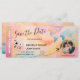 Destination Beach Wedding Boarding Pass Ticket Gold Plane Save the Date with heart and plane icon with unique pastel colorful world map. Add your photo