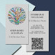 This unique QR Code business card is decorated with a colorful botanical mosaic design on a soft gray background.