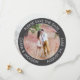 Announce the joyful news of your engagement and upcoming wedding with unique round custom photo save the dates. The 2 pictures and all wording on this invitation template are simple to personalize. (IMAGE PLACEMENT TIP: An easy way to center a photo exactly how you want is to crop it before uploading to the Zazzle website.) The gray and white design features a faux black chalkboard border, two pictures of the engaged couple, trendy modern minimalist typography, and stylish handwritten script calligraphy. This unique announcement note card is an elegant and fun way to inform friends and family of your upcoming special day celebration. Congratulations to the bride and groom!