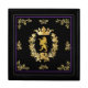This jewelry keepsake box is shown in the black box color with a sleek black background and a royal looking emblem of a 1 lions and crown in gold colorings, in center surrounded by a thin border in coordinating color and graced with petite rose sprays. Printed on top. Border shown in royal purple.