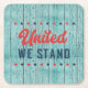 United We Stand text with stars in red and blue on distressed look blue wood plank background