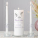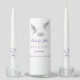 This unity candle set is shown with a doves and rings print, rings shown in silver. Text of bride and grooms names, wedding date and the phrase "Together As One ". Text shown in a purple color. doves print, only smaller with each separate name of bride / groom upon the tapers.