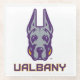The University at Albany Great Dane mascot logo features a stylized depiction of a Great Dane's head. The dog is illustrated with sharp, bold lines in purple and gray, giving it a fierce, confident expression. The ears stand tall, symbolizing alertness and strength. Underneath the Great Dane head is the word "UAlbany" written in bold, blocky golden letters outlined in purple, reinforcing the university's branding. This design represents UAlbany's sports teams, highlighting power, loyalty, and determination.