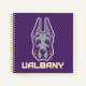 The University at Albany Great Dane mascot logo features a stylized depiction of a Great Dane's head. The dog is illustrated with sharp, bold lines in purple and gray, giving it a fierce, confident expression. The ears stand tall, symbolizing alertness and strength. Underneath the Great Dane head is the word "UAlbany" written in bold, blocky golden letters outlined in purple, reinforcing the university's branding. This design represents UAlbany's sports teams, highlighting power, loyalty, and determination.