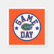 This spirited square paper napkin design proudly showcases support for the University of Florida Gators! It features the iconic Gators mascot head in vibrant green, blue, and orange, centered within a bold white circle. Above the gator, the word "GAME" is prominently displayed, and below it, "DAY" is boldly presented, both in blue lettering. Two blue stars flank the Gator head, adding to the energetic display. The design is framed by a bold blue inner ring and set against a bright orange background, making it an ideal choice for any game day celebration or gathering.