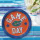 This spirited paper plate design proudly showcases support for the University of Florida Gators! It features the iconic Gators mascot head in vibrant green, blue, and orange, centered on a bold orange background. Above the gator, the word "GAME" is prominently displayed, and below it, "DAY" is boldly presented, both in white, arched lettering. Two blue stars flank the Gator head, adding to the energetic display. The plate is framed by a wide blue outer rim, making it an ideal choice for any game day celebration or gathering.