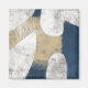 A large abstract shape in navy blue covers the canvas edge to edge with cutouts revealing a textured white background. A worn, textured beige area sits over the blue shape while white lines twist like rope in a dynamic finish to the piece.