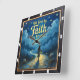 A visually rich wall clock depicting a solitary person on a path, moving towards a radiant glow under a celestial sky filled with stars and soft clouds. The powerful message, "we live by faith, not by sight. 2 Corinthians 5:7," is clearly visible. This beautifully framed timepiece symbolizes the act of trusting God's plan even when the path ahead is unclear, offering a constant source of encouragement and spiritual reflection.