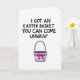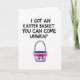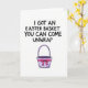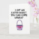 This card features a white background with a tall, centered layout that feels like a direct note to someone special 🐰. Across the upper half, large black hand-drawn lettering reads “I GOT AN EASTER BASKET YOU CAN COME UNWRAP,” with the words stacked to fill most of the space. The casual letter shapes add a flirty friendliness, like an inside joke shared between close friends or sweethearts. Below the text sits an empty gift basket, positioned in the lower center as the main illustration. The basket is colored in soft lavender with a deeper violet interior, and its curved handle arches upward in a gentle loop 🐇. A bright fuchsia-pink bow is tied around the middle, suggesting a thoughtful touch meant for someone who’s been on the giver’s mind. A faint shadow under the basket keeps it grounded, and the bow’s loops and trailing ribbon ends are drawn with smooth, simple lines.
