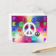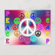 colorful retro look peace card with many colored smaller peace signs surrounding one larger white one bracketed by the word peace written vertically down and up