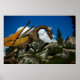 A dragon walks up a hill covered in many great rocks.