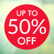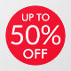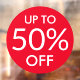 For sale window cling with white text "up to 50%" on red circle background. You can change the percentage in the template field.