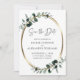 Updated QR Code Eucalyptus Gold Metallic Wedding Save the Date Invitation... Our luxe botanical Save the Date card features a gold metallic oval frame embellished with dusty green and emerald-hued eucalyptus leaves creating a natural looking border for the announcement text within. The back of the card contains your wedding website information and a QR code graphic template you can replace with your own code simply by typing your wedding website URL. All example text (except for Save the Date) can be easily revised with your own details on the personalization template.
