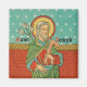 In this detail of a 19th-century Belgian devotional print, a mature, gray-haired St. Joseph stands in front of a red wall hanging with golden yellow trim. The tapestry is patterned with equal-armed crosses enclosed in rotated squares. How it is hung defies logical explanation because the background consists of an infinitely deep aqua-blue sky bespattered with stars. + St. Joseph is richly garbed in strong colors. His robe is red; his mantle, green with a dark aqua lining and golden yellow borders. He holds a spray of white lilies symbolizing purity in his right hand and an L-shaped brown wooden carpenter’s rule indicative of his profession in his left. Beneath St. Joseph’s sandaled feet in the full-length image that appears, for example, on our greeting cards and posters in this COLLECTION are additional attributes--a small dragon, a crown, a scroll, and a globe inscribed with the names of the populated continents—that speak to his role as protector of The Church. + This chromo- or color lithograph was originally published to promulgate Pope Leo XIII’s “Prayer to St. Joseph” of 1889. + Principal Feast of St. Joseph: March 19; Feast of St. Joseph the Worker: May 1 + Image Credit (VVP 09): Detail of an antique chromolithograph of Saint Joseph, Protector of the Church, Pray For Us [H. Jozef, beschermer der H. Kerk, B.V.O.] originally published by K[arel] v[an] d[er] Vyvere-Petyt, Bruges, Belgium, c. 1890, from the designer’s private collection of religious ephemera.